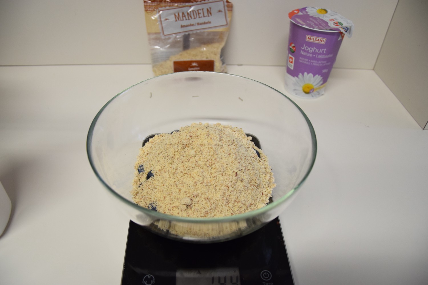 - Combine the almond flour and yogurt in a mixing bowl. Use a fork or spoon to stir until you achieve a smooth, slightly thick batter. Image 1 & 2