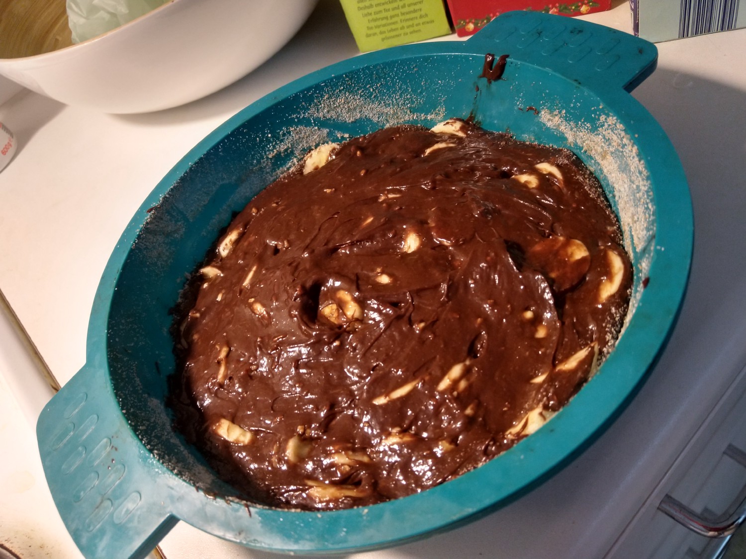 - Mix the remaining dry ingredients (flour, cocoa powder, baking powder and optionally hazelnuts) and add them to the egg-sugar mixture. Stir until you get a homogeneous mass.