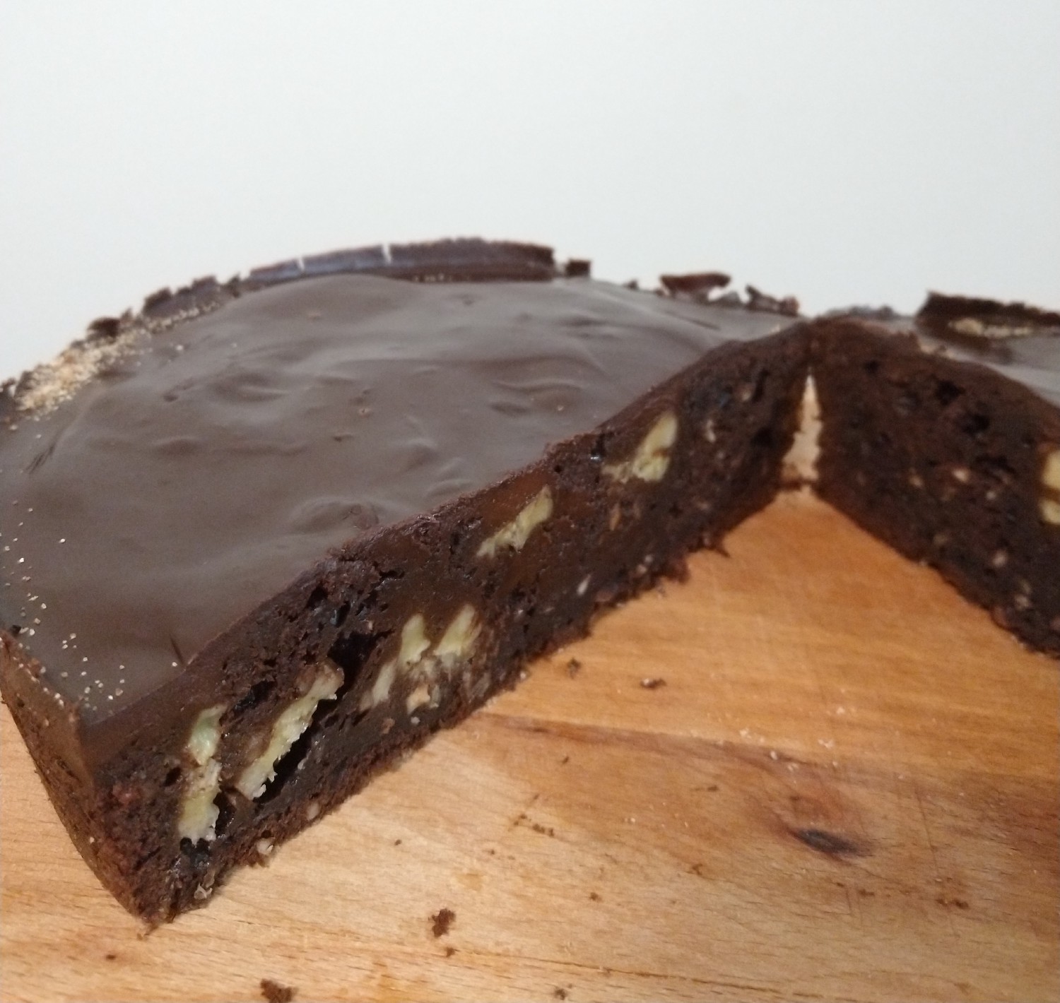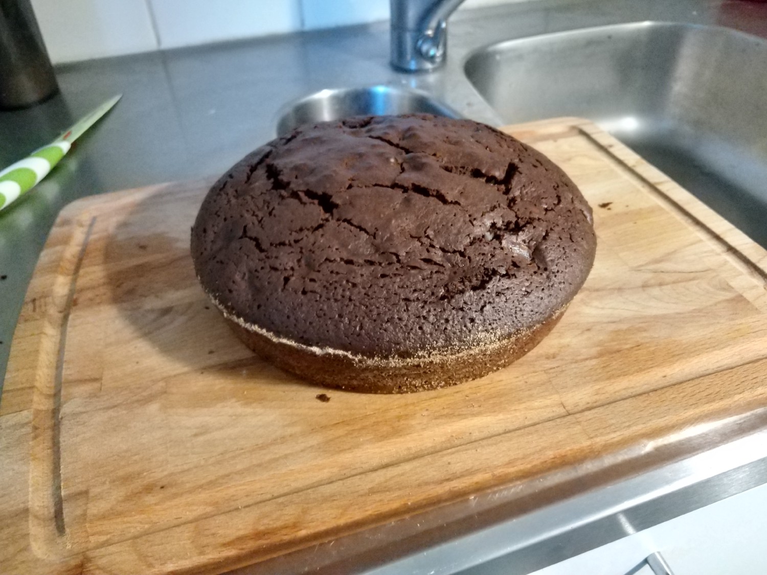 - While the cake is cooling down, heat up the (liquid) whipping cream until it almost boils and then mix in the remaining chocolate bar (100 gr). Apply this ganache mixture on top of the cake with a spatula (see Image 3).