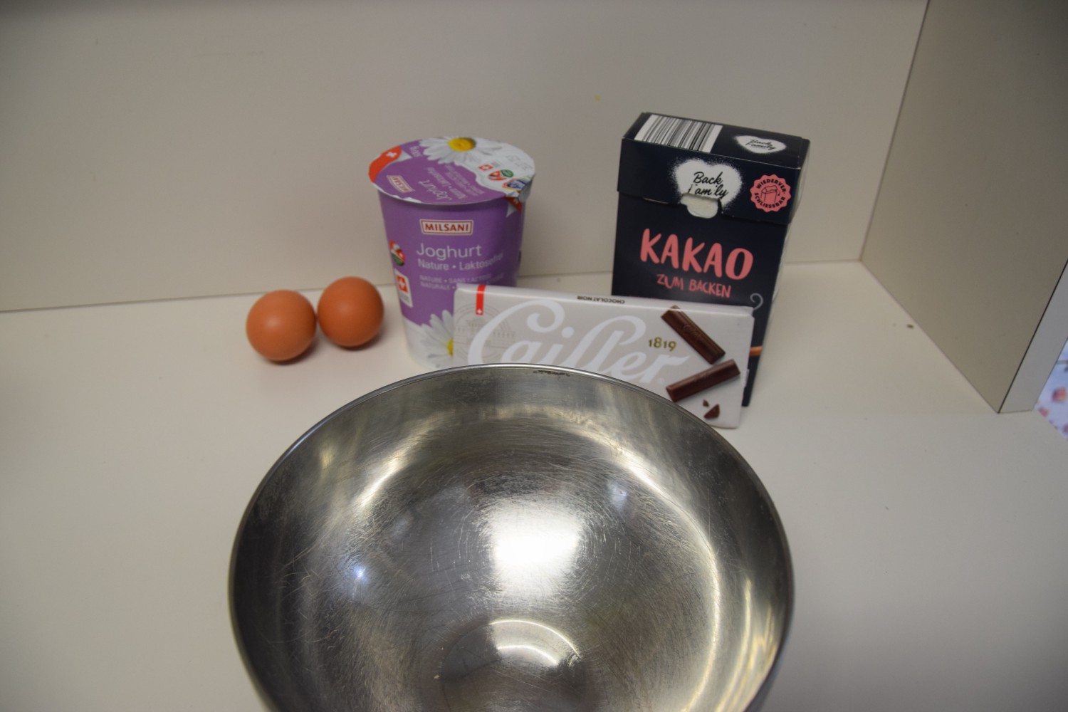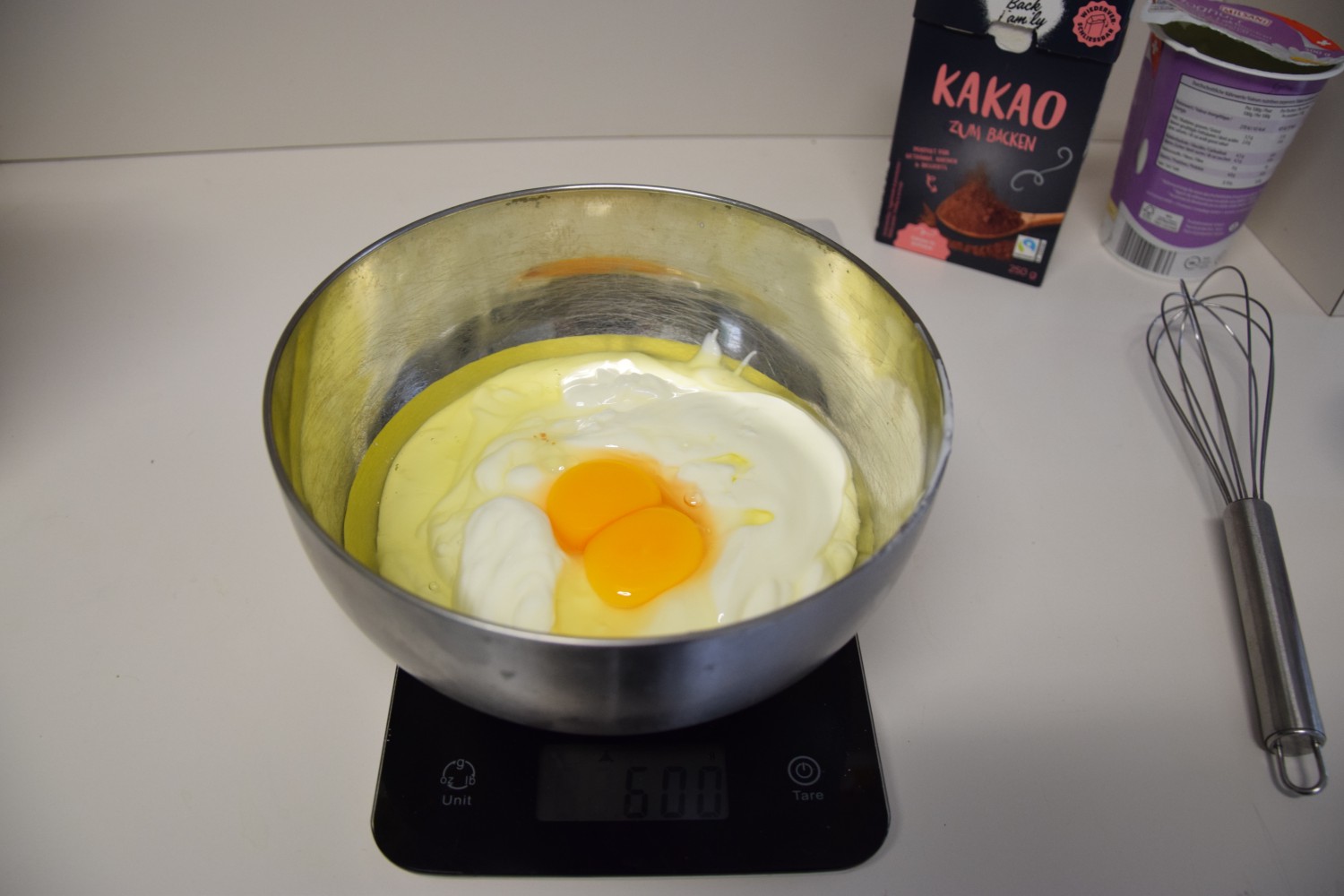 - Start by pouring in a bowl 500 g lactose-free yogurt, add 2 eggs and whisk until smooth. Image 2