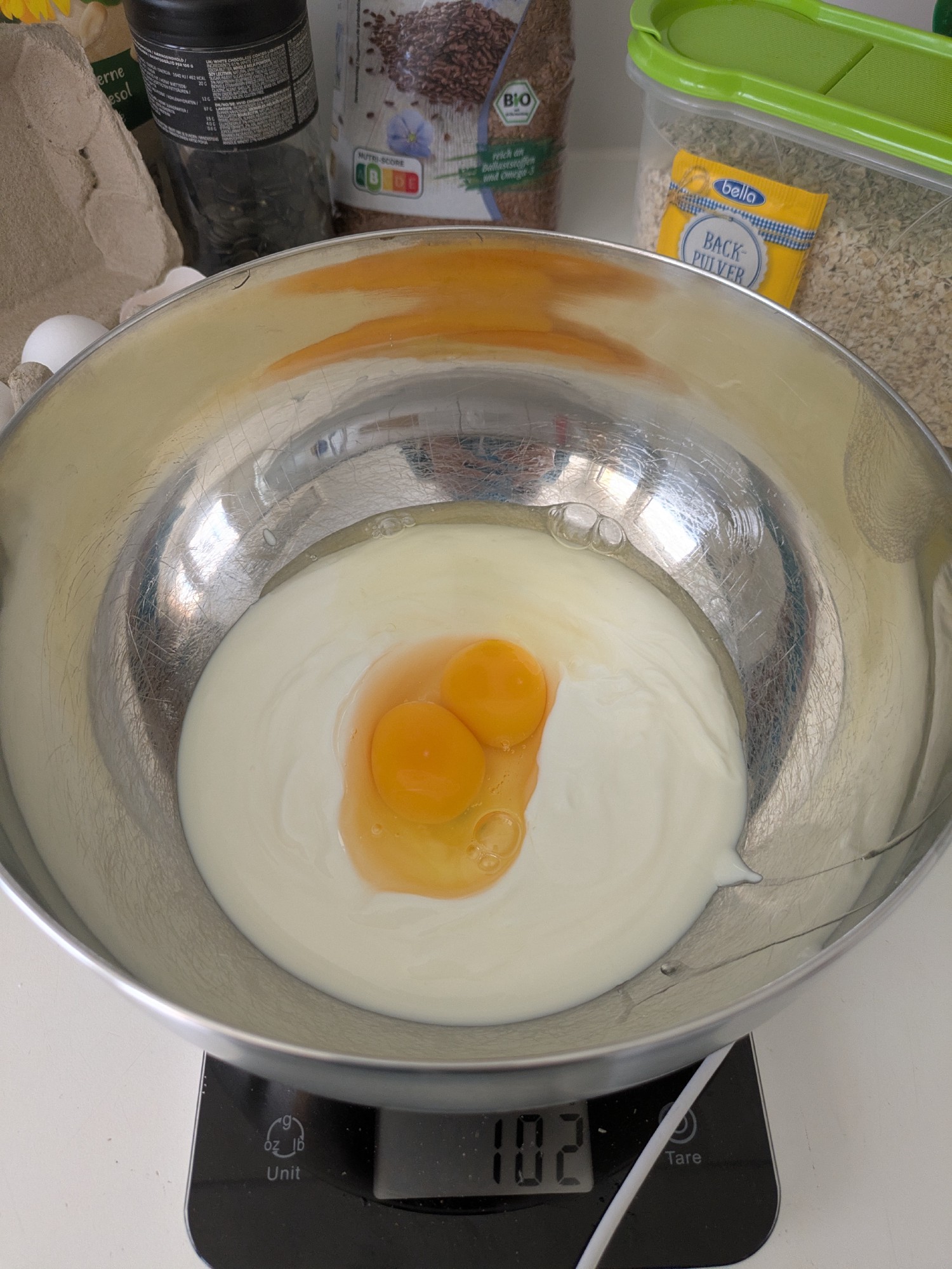 - Mix wet ingredients: In a large bowl, combine the yogurt and eggs until smooth. Image 1, 2, 3