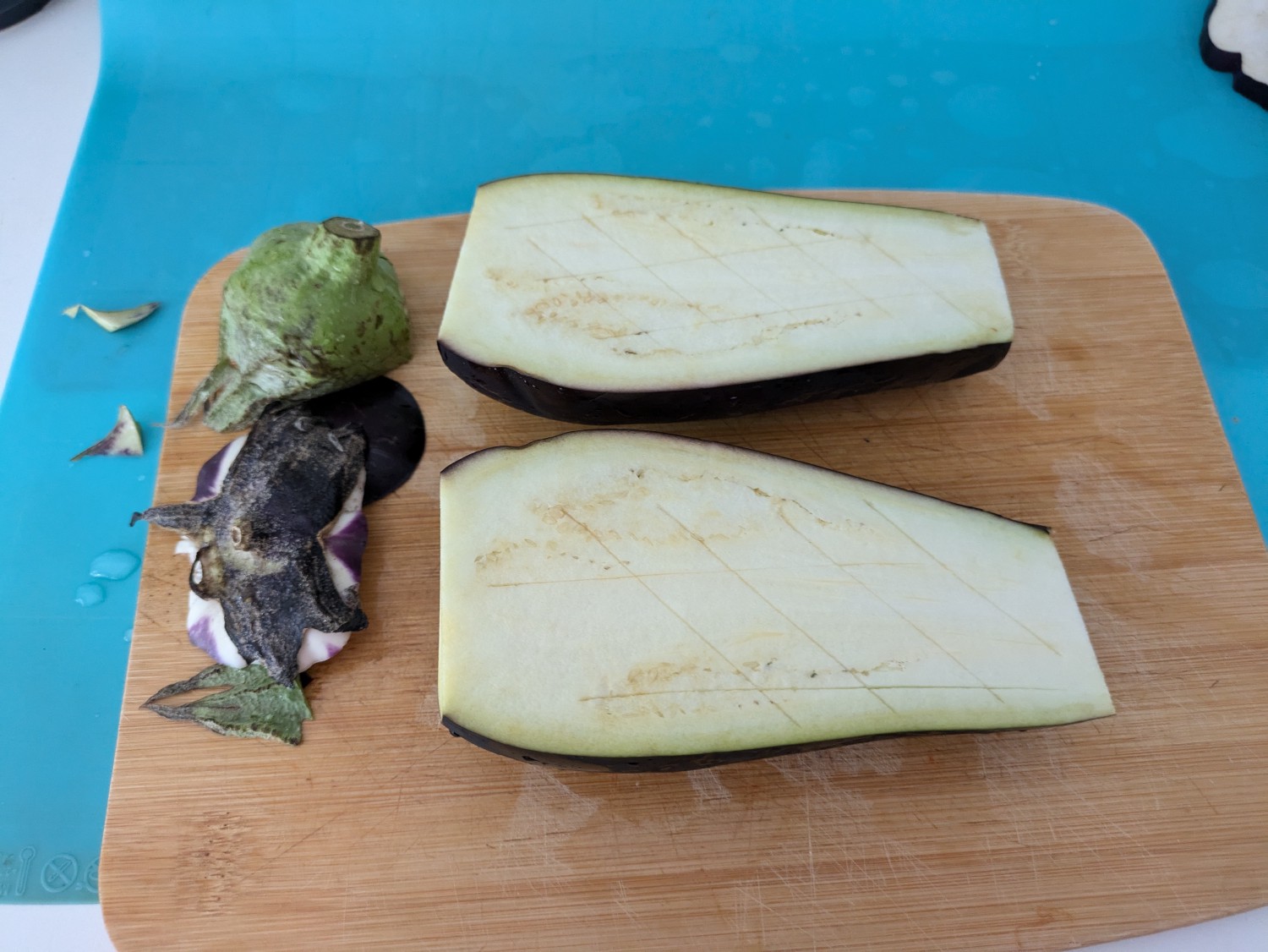 - Make several cuts on the center part of the aubergines to help them cook evenly.