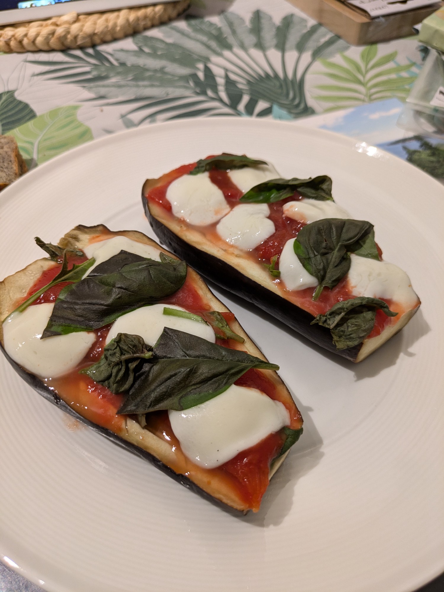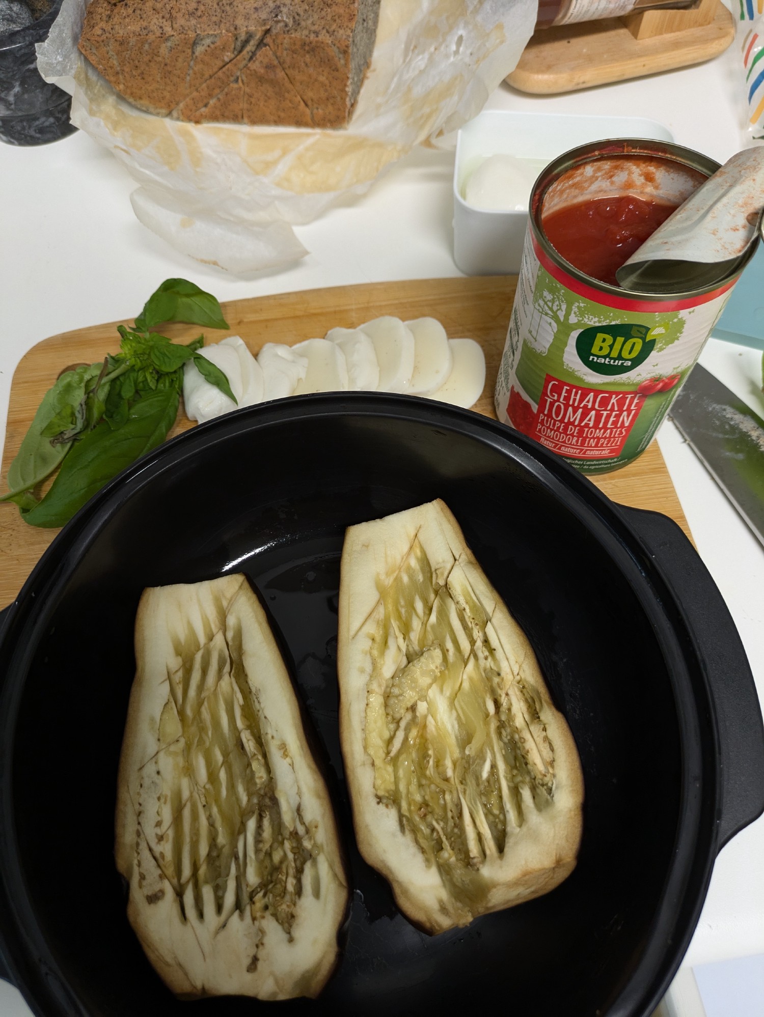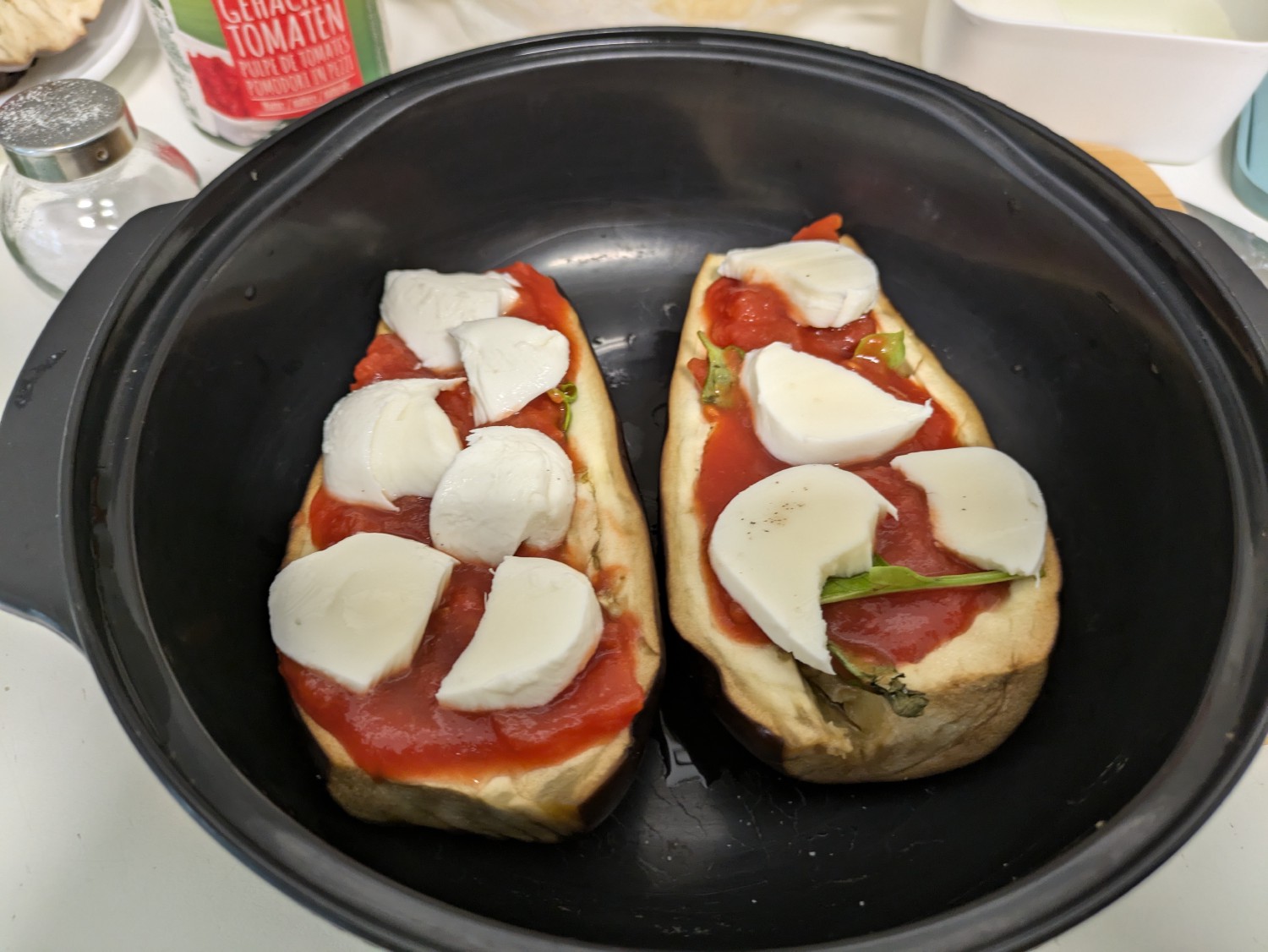 - While the aubergines are cooking, cut the mozzarella into small pieces.