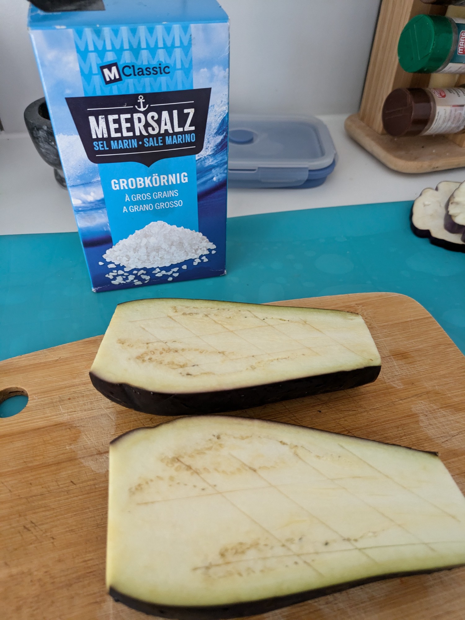 - Sometimes, aubergines can have a pungent taste. To mitigate this, apply coarse salt to the cut aubergine and let it rest for at least 30 minutes before cooking it. This process will extract some of the water from the aubergine, thereby removing the pungent taste.Image 6