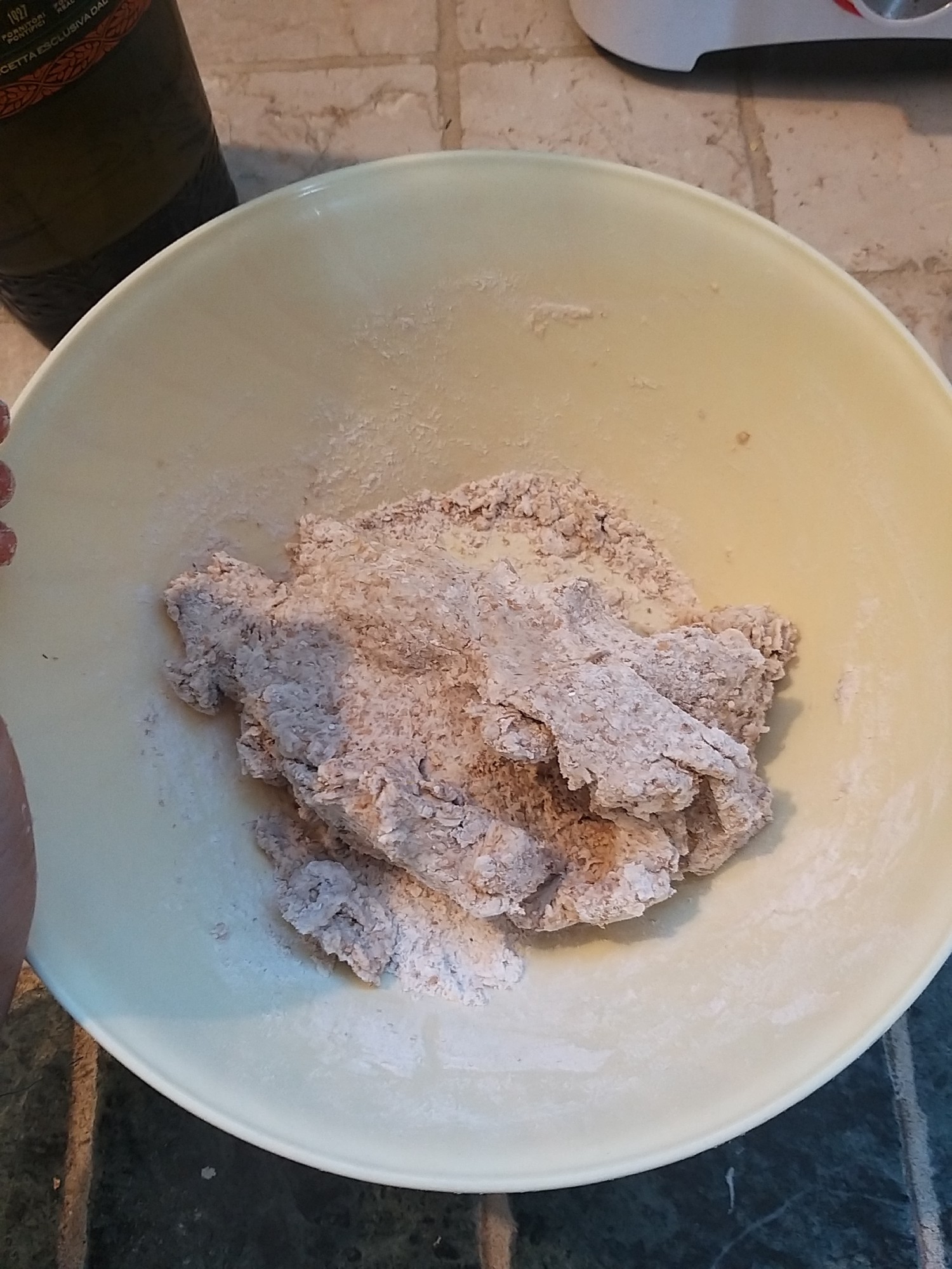 - Add water and oil to the bowl and mix again with a fork until crumbles start to form Image 3. At this point continue kneading with your hands and form a smooth ball with the dough Image 4 and Image 5.
