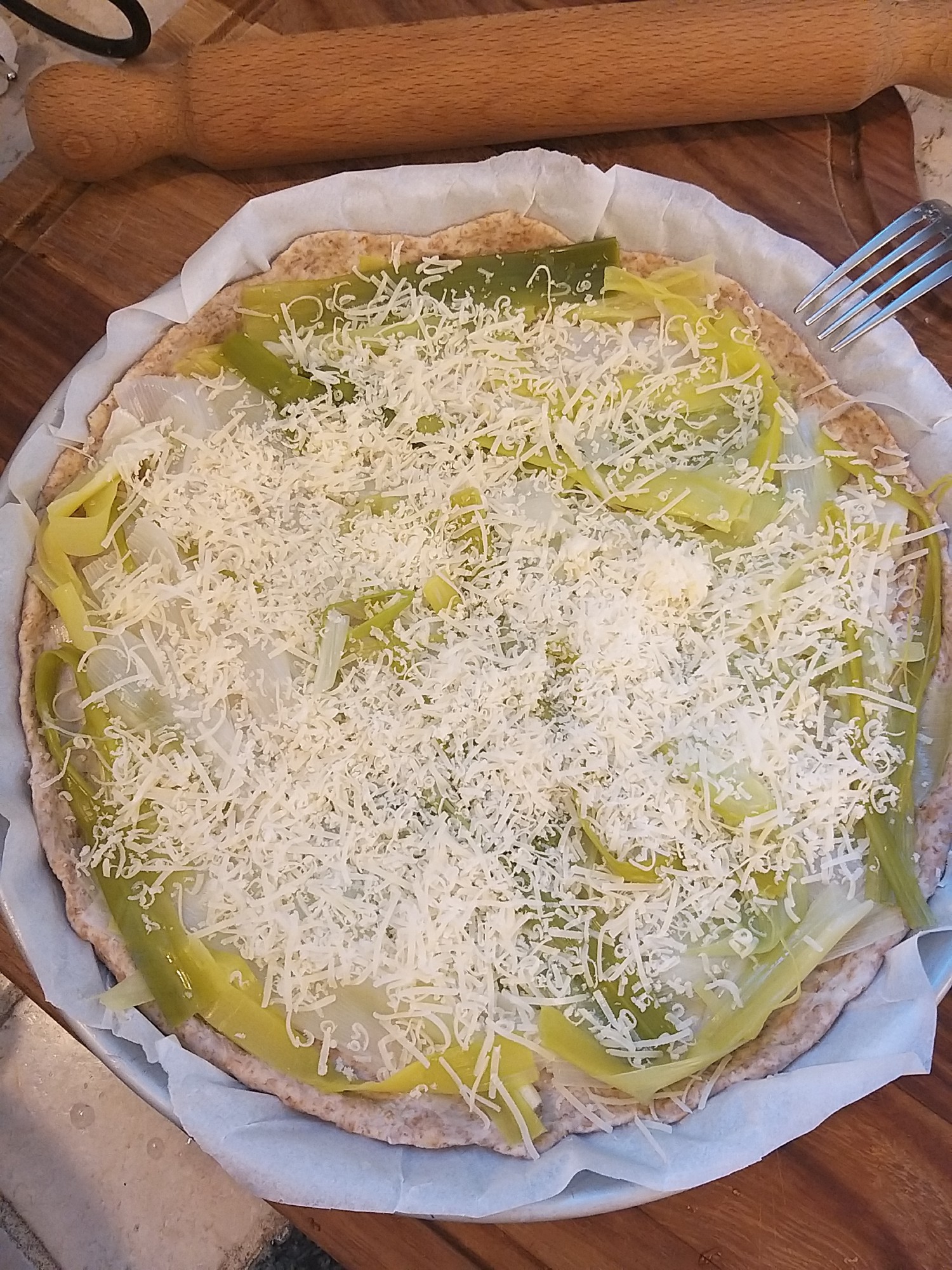 - Then I put it in a round baking shape and topped it with leeks, parmesan, salt, pepper and a bit of oil Image 7.