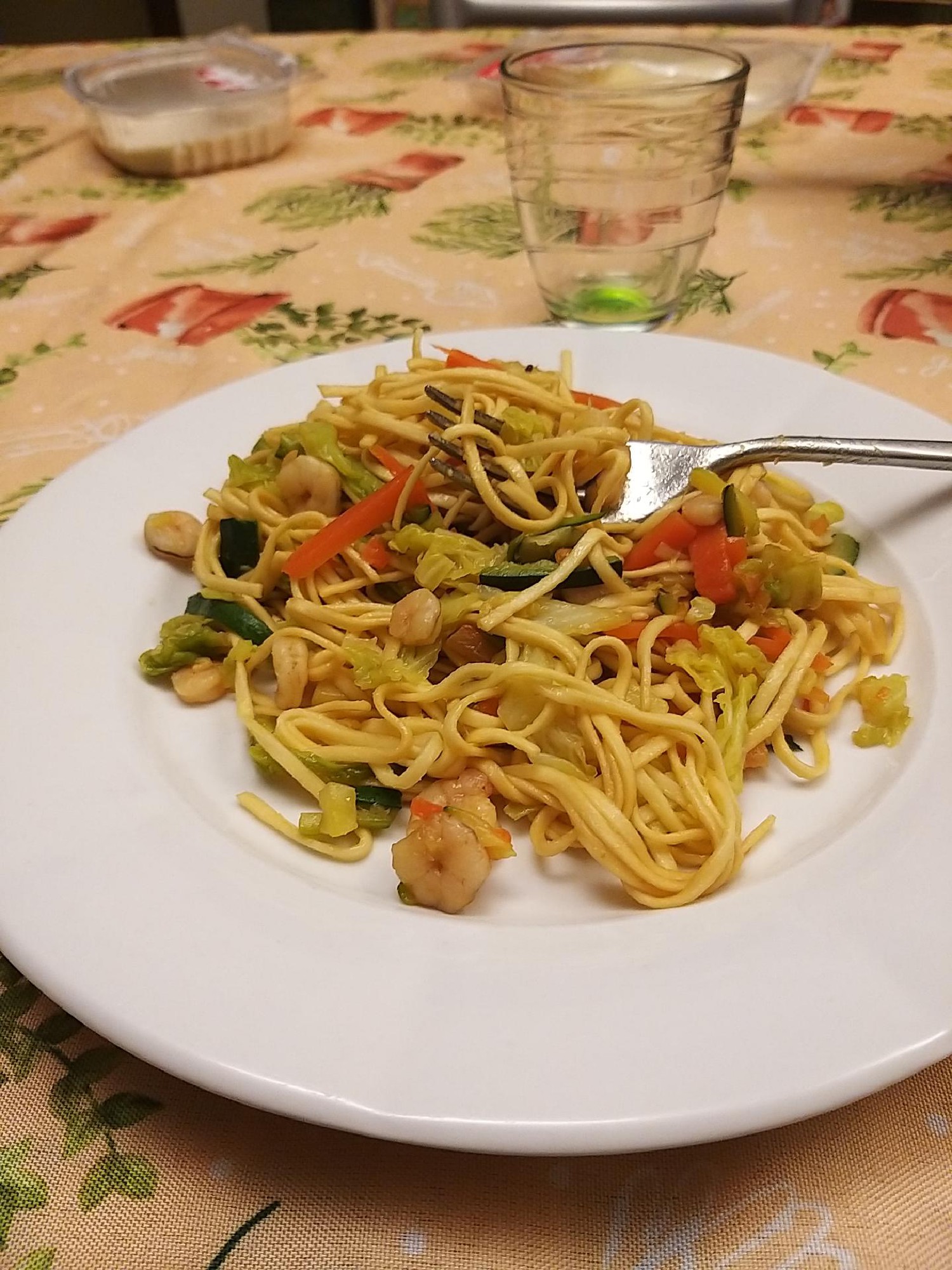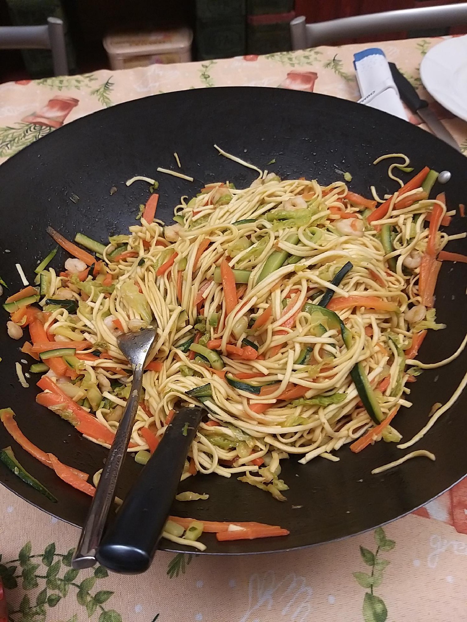 - When the noodles are ready, add them to the pan with the vegetables and the shrimps. Add the soy sauce as a dressing, put as much as you like. I suggest you to taste it and add if necessary (Image 2).